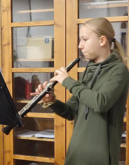 Schülerinnen der Musikschule Hambach bereicherten den musikalischen Teil mit Instrumentalstücken. Es spielten Lina Möller und Ingrid-Marie Stecher vierhändige Stücke auf dem Klavier und Lena Blumenstiel die Sonate D-Moll Adagio und Allegro (Chr. Schaffrath) auf der Oboe.