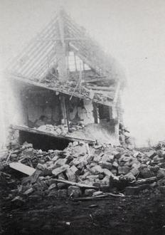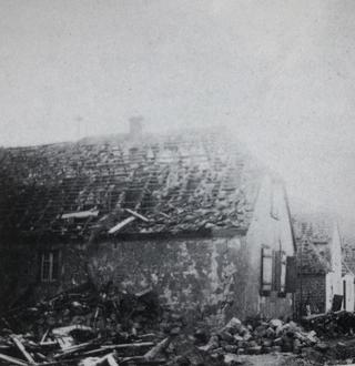 Ich saß mit meinen sechs Jahren über meinen Hausaufgaben, als plötzlich ein lautes Brummen und Knallen zu hören war. Die Bomben fielen. Bei uns hatte das Glück im Unglück zugeschlagen – nur die hintere Scheune wurde getroffen. Das darin gelagerte Heu wurde durch die Wucht der Explosion in die hinteren Räume des Hauses gedrückt. Gleichzeitig sorgte es dafür, dass der Druck teilweise abgefangen wurde und Schlimmeres verhindert werden konnte.
