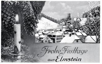 Die Karte zeigt eine stimmungsvoll gezeichnete Winteransicht von Elmstein: verschneite Dächer, der markante Turm der Elmsteiner Burgruine sowie der von Wald umrahmte Ortskern vermitteln die Atmosphäre eines ruhigen, festlichen Dorfes in der Adventszeit. Ergänzt wird das Ortsmotiv durch eine brennende Kerze und Tannenzweige – typische Weihnachtssymbole der 1950er-Jahre, die vielen Grußkarten dieser Zeit ihre besondere Wärme verliehen.