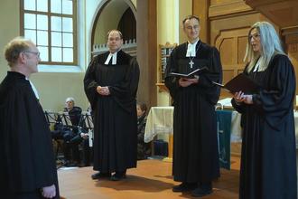 Gemeindediakon Matthias Vorstoffel (links) wurde in der prot. Kirche in Elmstein durch Dekan Andreas Rummel in sein Amt eingeführt. „Mutmachworte“ sprachen Pfarrerin Maria-Luise Lautenbach und Pfarrer Martin Groß.