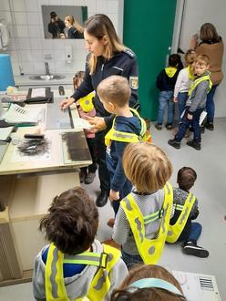 Viele freundliche Polizisten begegneten den Kinder im Gebäude und ließen ihre Herzen höher schlagen. Der imposante Ausblick aus dem obersten Stockwerk des Polizeigebäudes verdeutlichte noch einmal, wie viele Stockwerke hier für die Sicherheit der Bevölkerung arbeiten - besonders wichtig für den Schutz von Familien und Kindern. Nachdem die Kinder selbst Fingerabdrücke nehmen durften und ihnen gezeigt wurde, warum Warnwesten für die Gruppe so wichtig sind, war es bald Zeit für den Rückweg.