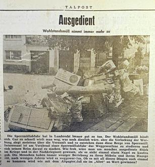 Lambrecht. (WD) Schon öfter wurde über Müllprobleme in der Stadt Lambrecht berichtet. Es ist ein Thema mit langer Tradition, wie sich beim blättern in alten Talpost-Ausgaben herausstellte. Der Artikel wurde am 18.Juli 1953 veröffentlicht.