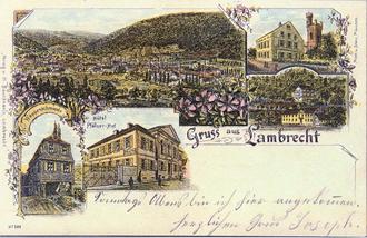 Die um 1900 gelaufene Ansichtskarte zeigt Lambrecht in einer typischen Mehrbilddarstellung der Jahrhundertwende. Insgesamt sind fünf Motive zu sehen, die einen lebendigen Eindruck vom Ort und seiner Umgebung vermitteln.