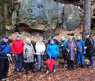Drei „Unerschrockene“, zwei „Wanderdamen“ in Begleitung eines männlichen „Wegweisers“ wollten es wissen und begaben sich auf den etwas weiteren Wanderweg. Vom Parkplatz am St. Martiner Weiher ging es erst einmal stramm bergauf zum „Schorle-Stumpe“. An dem ansonsten schönen Rastplatz mit Sitzgelegenheiten und Tiefblick nach St. Martin, legte man stehend im Schnelldurchgang eine kurze Trink- und Süßigkeitspause ein. Schnell noch ein paar Fotos geschossen und weiter ging es auf breitem Wanderweg kurz unterhalb des Gipfelplateau des Hochbergs bis man auf den Wanderweg, von der Hesselbachhütte kommend, stieß. Ab hier ging es fast nur noch bergab zum Endziel Friedensdenkmal. Vom Parkplatz am Hilschweiher machten sich drei betagte und noch in Rekonvaleszenz befindliche Vereinsmitglieder auf zum gemeinsamen Wanderziel.