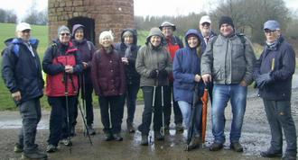 Die Wanderer stehen, bei einem kurzen Regenschauer, vor dem Wartturm.