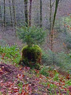 Möge die kleine Fichte rechtzeitig mit ihren Wurzeln das Erdreich erreichen, bevor der morsche Baumstumpf in sich zusammenfällt.