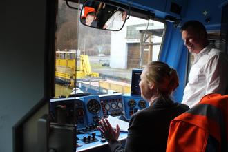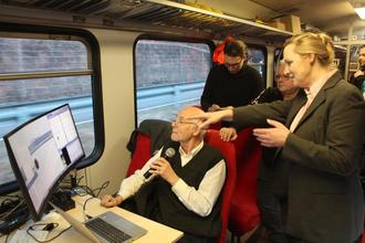 Oliver Brückom erklärt der Ministerin die ETCS-Technik im Führerstand des Labortriebwagens