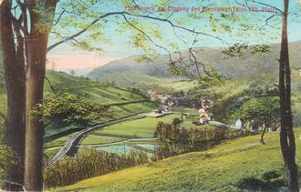 Frankeneck. Diese wunderschöne Ansichtskarte aus der Sammlung von Udo Grimm zeigt eine weit geöffnete Perspektive auf das Dorf Frankeneck um das Jahr 1914. Die Szene ist von viel Licht durchflutet, die umliegenden Hänge sind mit Wiesen und Feldern bedeckt, während der Wald erst weiter oben beginnt. Links im Bild verläuft das Gleis der Kuckucksbahn. Wer genauer hinsieht, erkennt die Überführung der Landstraße und des Speyerbaches.