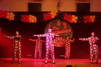 Den fliegenden Wechsel zwischen Wortwitz und Tanzkunst vollzogen die „Großen Funken“ im Alter von zehn bis fünfzehn Jahren, deren Gardetanz die Stimmung im Saal zum Kochen brachte. Als roter Faden durch das gesamte Programm fungierte die närrische Hausband „2imT“. Ob zur Schunkelrunde, zur Polonäse oder als Pausenfüller, das Duo hielt die Halle stets auf Betriebstemperatur.