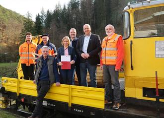 Erfenstein. (hoa) Am Freitag, den 21. Februar kam die rheinlandpfälzische Ministerin für Klimaschutz, Umwelt, Energie und Mobilität, Katrin Eder, nach Erfenstein im Elmsteiner Tal, um einen Förderbescheid in Höhe von 130.000 EUR an die Kuckucksbähnel Bahnbetriebs GmbH zu übergeben. Die Mittel werden verwendet für die komplette Gleisfelderneuerung eines 320 m langen Streckenabschnitts zwischen Erfenstein und Breitenstein sowie zweier Bahnübergänge.
