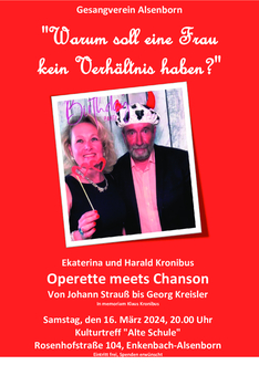 Die Wurzeln für das deutschsprachige Chanson ab der ersten Hälfte des 20. Jahrhundert sind unter anderem auch in der Operette zu suchen. Es gibt somit zwischen den beiden Genres etliche Berührungspunkte, aus denen die beiden Künstler ein abwechslungsreiches, heiteres, bisweilen auch nachdenkliches Programm zusammengestellt haben - in Erinnerung an ihren im Sommer 2022 verstorbenen Vater bzw. Schwiegervater Klaus Kronibus, der mit seinen mit dem Gesangverein Alsenborn gestalteten Revuen über mehr als ein Vierteljahrhundert die Kulturszene unseres Orts bereicherte.