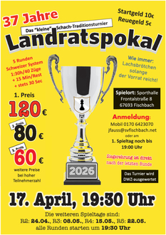 Auch in diesem Jahr richtet der SV Fischbach wieder den Landratspokal aus. Wir starten am 17.04.2026 um 19:00 Uhr (Ende der Anmeldung vor Ort) in der Sporthalle Fischbach. Alles weitere entnehmen Sie bitte unserem Plakat. Auch Schachneulinge können mitspielen. Einzige Voraussetzung ist, die Schachregeln zu beherrschen.
