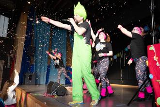 Troll Joachim begrüßte mit seinen beiden Helferinnen - den Trollen Lara und - die gut gelaunten Kinder und startete das Programm mit einer Polonaise durch die volle Halle.