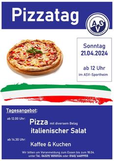 Erstmalig bietet der ASV am 21. April einen Pizzatag im Vereinsheim an. Bereits zum Mittagessen werdet Ihr mit Pizzas in allen Varianten und italienischem Salat verköstigt. Bei italienischer Musik laden wir Euch zu gemütlichen Stunden im Kreise der ASV-Gemeinde ein. Am Nachmittag bieten wir zusätzlich noch Kaffee und Kuchen an.