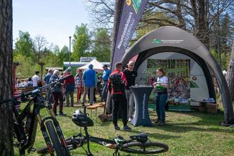 Infostand Mountainbikepark Pfälzerwald mit Trikotverkauf und Fotobox