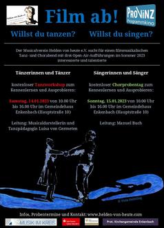 Der Musicalverein „Helden von heute e.V.“ sucht für seine Produktion „Film ab!“ im Jahr 2023 noch interessierte und talentierte Tänzer*innen und Sänger*innen.