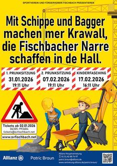 Unter dem diesjährigen Motto "Mit Schippe und Bagger machen mer Krawall, die Fischbacher Narre schaffen in de Hall" nehmen die Fischbacher Narren Sie mit auf den Bau, die Sporthalle wurde hierfür in eine Großbaustelle voller Farbe, Spaß und närrischer Energie verwandelt.