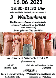 Tische sind ab dem 19.05.2023 über Weiberkram-mvs@web.de buchbar. Die Tischgebühr beträgt € 15,00.