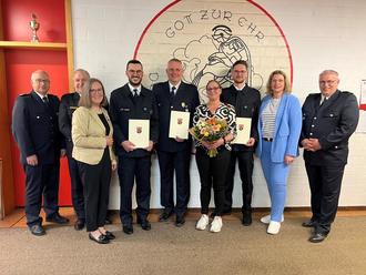 Bürgermeisterin Silke Brunck und die 1. Kreisbeigeordnete Gudrun Heß-Schmidt dankten den Geehrten für ihren jahrzehntelangen selbstlosen Einsatz und die Bereitschaft zur Übernahme von Verantwortung für andere Menschen. Ein besonderer Dank ging auch an die Familien der Geehrten, die allzu oft ihre Angehörigen für Übungen und Einsätze entbehren müssen.