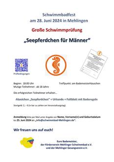 die an der großen „Seepferdchen“-Prüfung teilnehmen (Treff um 18:00 Uhr am Bademeisterhäuschen; Startgeld 2,-- €).