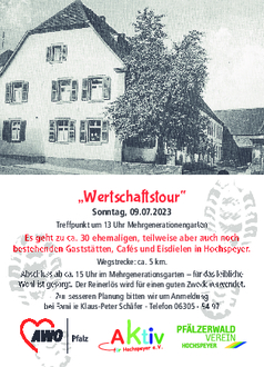 Der PWV Hochspeyer bietet am 09.07.2023 gemeinsam mit der AWO und Aktiv für Hochspeyer eine Wertschaftstour zu ca. 30 Gaststätten, Cafés etc. in Hochspeyer an. Wegstrecke: ca. 5 km. Treffpunkt ist um 13 Uhr am Mehrgenerationengarten. Zur besseren Planung bitten wir um Anmeldung bei Fam. Klaus-Peter Schäfer, Tel. 06305/5497.