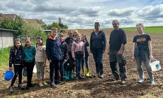 Im Mai stellte uns Bauer Urschel einen großen Feldabschnitt angrenzend an das Neubaugebiet im Dellchen zur Verfügung. Die Kinder sähten gemeinsam eine Insektenwiesen-Mischung aus und steckten zusätzlich Sonnenblumensamen in die Erde. Seit Wochen regnet es nun kaum und die Sorge war groß, ob unsere Blumenwiese überleben würde.