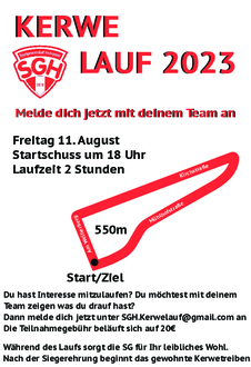 Anmeldungen sind ab jetzt per Mail unter SGH.Kerwelauf@gmail.com möglich. Bitte sowohl den Teamnamen als auch den Kapitän/Ansprechperson nennen.