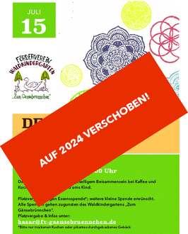 Aufgrund mehrerer Umstände müssen wir die Planung für den Decken- und Kistenbasar leider auf das nächste Jahr verschieben. Wir werden Euch aber weiterhin auf dem Laufenden halten, was wir noch in diesem Jahr für Freunde des Waldkindergartens und alle, die es werden wollen, vorbereiten. Ein Beispiel: Man mag bei diesen Temperaturen kaum daran denken, doch werden wir beim Tannenbaumschlagen der Gemeinde auch in diesem Jahr mit Verpflegung für den gemütlichen Rahmen sorgen.