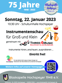 Dieses Jahr wird die Blaskapelle 75 Jahre alt. Beginnen werden wir das Jubiläumsjahr mit einer Instrumentenschau für Kinder, Jugendliche und (Wieder-)Einsteiger am 22. Januar 2023 um 10:30 Uhr in der Schulturnhalle.