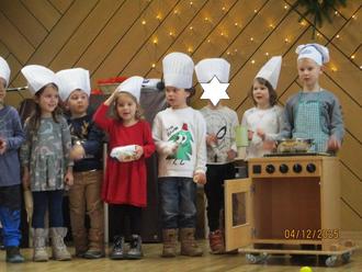 Ausgestattet mit Backzubehör und verkleidet als kleine Bäcker sangen die Kinder zu Beginn das Lied „In der Weihnachtsbäckerei“ und sorgten damit für fröhliche Stimmung.