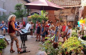 Zur letzten Singstunde vor den Ferien trafen sich die jungen Mitglieder des Kinderchors im „Goldcafe“ in Enkenbach um in die Sommerpause zu starten. Bevor jedes Chormitglied als Anerkennung für die geleistete Arbeit im Chor in zurückliegender Zeit ein schmackhaftes Eis bekam, unterhielten die Kinder die anwesenden Gäste überraschend, unter der Leitung ihrer Dirigentin Ekaterina Kronibus, mit einigen schwungvollen Liedern.