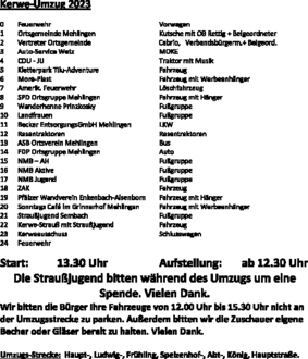 Die Abnahme der Umzugswägen durch die Verbandsgemeinde erfolgt am Sonntag, 20.08.2023 um 13.00 Uhr. Bitte alle Teilnehmer die Checkliste ausgefüllt und unterschrieben bereithalten.