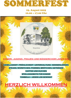 Der GVE lädt am 23.08.2025, ab 10:00 Uhr, alle Mitbürgerinnen und Mitbürger zu seinem diesjährigen Sommerfest am und im Sängerheim, Birkenstraße 6, 67677 Enkenbach, recht herzlich ein.