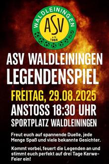 Bevor die Kerwe startet, veranstaltet der ASV Waldleiningen am Freitag, dem 29.08. um 18:30 ein Spiel der Legenden des ASV. Viele bekannte Gesichter haben sich bereits angekündigt; es wird mit Sicherheit ein tolles Spiel werden. Vorbeikommen, dabei sein, einen tollen Abend verbringen!