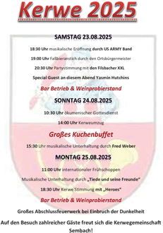 Also seien Sie gespannt und feiern Sie mit uns die „Sembacher Kerwe 2025“. Für Essen und Trinken wird reichlich gesorgt sein.