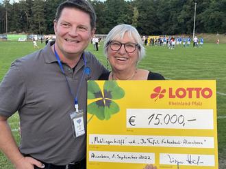 Die Destinatäre „Enkenbach-Alsenborner Tafel“ und „Mehlingen hilft“ können sich über die Spendensumme von 15.000 Euro freuen, die das Benefizspiel der Lotto-Elf gegen den SV Alsenborn & Freunde eingespielt hat. Im Vorfeld des Spiels hatte der SV Alsenborn bereits in eigener Verantwortung eine Spendensumme von 11.000 € zusammengetragen, dazu kamen die Einnahmen des Ticketverkaufs, so dass die stolze Summe von 15.000 € in der Halbzeit des Spiels vom Geschäftsführer der Lotto- Rheinland-Pfalz Jürgen Häfner an Dr. Brigitte Schulz von der „Tafel“ und Kai Ellenberger von „Mehlingen hilft“ übergeben werden konnte. Ein herzlicher Dank geht an alle Spenderinnen und Spender, sowie die 1000 Besucherinnen und Besucher unseres Spiels.