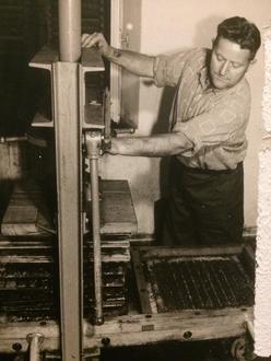 Das ältere Bild zeigt Bernhard Ruby in den 70-igern an der Packpresse