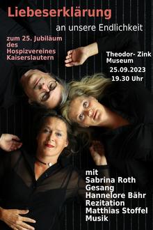 Im Rahmen der 25 Jahre Veranstaltungsreihe des Hospizverein für Stadt und Landkreis Kaiserslautern e.V. lädt dieser am Montag, den 25. September um 19:30 Uhr (Einlass ab 19 Uhr) zur Veranstaltung „Liebeserklärung an unsere Endlichkeit“ in die Scheune des Theodor-Zink-Museums in Kaiserslautern ein.