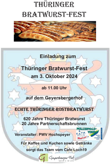 Zum Thüringer Bratwurstfest am Tag der Deutschen Einheit, dem 03.10.2024, auf dem Geyersbergerhof, laden wir alle recht herzlich ein. Beginn ist um 11 Uhr. Für Kaffee und Kuchen sowie Getränke sorgt das Team vom Cafe Loch 19.