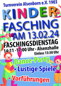 Der TV-Alsenborn bietet in diesem Jahr wieder seine traditionelle Kinderfaschings-Party am Dienstag, 13.02.2024 in der Alsenzhalle an. Das Programm startet um 14:11 Uhr. Einlass ist ab 13:30 Uhr. Der Eintritt beträgt 2€