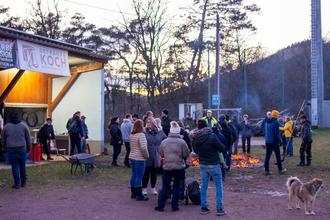 Dort wartete die Oischerrcrew mit speziellen Rhythmen an der Glut. Pünktlich kurz vor 18 Uhr wurden dann die Braten aus der Glut genommen und mit frisch zubereitetem Kartoffelsalat serviert.