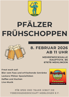 Die Ortsgemeinde Mehlingen und die Vereinsgemeinschaft laden am Sonntag, den 08.02. um 11:00 Uhr zum Pfälzer Frühschoppen ein. Dieser findet in der Mehrzweckhalle statt.