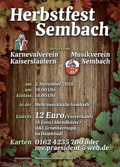 Am 02. November 2024 laden der Karnevalverein Kaiserslautern und der Musikverein Sembach zum Pälzer Herbstfest ein.