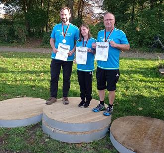 Das Foto zeigt v. l.n. r. Adrian Willenbücher, Vizelandesmeister, Ronja Möckel, Landesmeisterin, und Jürgen Möckel, Vizelandesmeister der Landesmeisterschaft Bogen im Freien 2025.