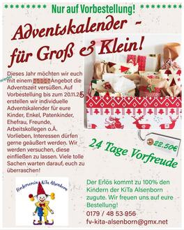 Nachdem unsere Idee der individuellen Adventskalender im letzten Jahr rundherum gut ankam, gehen wir in die 2. Runde. Auf Vorbestellung bis zum 20.11. können Sie einen individuellen Adventskalender bei uns in Auftrag geben. Unsere „Elfen“ werden 24 Päckchen für Sie zusammenstellen und in einer hübschen Box überreichen. Die 22,50 EUR gehen zu 100% an die Kinder der KiTa Alsenborn. So freuen Sie sich über einen ganz individuellen Kalender und die Kinder über neues Spielmaterial oder spannende Ausflüge.