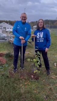 Angemessen zur aktuellen Baumpflanz-Challenge setzten unsere 1. Vorsitzende Gudrun Heß-Schmidt und unser Co-Trainer der zweiten Mannschaft Thomas „Kloppo“ Börtzler einen Fliederbaumsetzling im Stadion an der Kinderlehre ein.