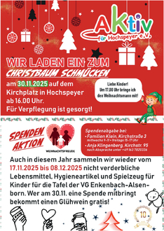 Auch dieses Jahr wird der Weihnachtsbaum in der Dorfmitte in weihnachtlichem Glanz erstrahlen. Der Verein Aktiv für Hochspeyer e. V. veranstaltet am