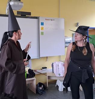 Doch auch die freuten sich über eine Stunde Bewegung und kamen ordentlich ins Schwitzen. Zauberer Schrappelschrut und die Hexe stritten um den Zauberstab und dann verwandelte die ungeübte Hexe die Gruselgestalten in Tiere. Doch das ging schief, anstelle von Katzen tobte eine wilde Meute Tiger durch den Saal. Dem Zauberer gelang es die gefährlichen Tiere zurück zu verwandeln, doch dann hatte er einen Hexenschuss. Die Hexe zeigte der Klasse ein paar Massagetricks und auch dem Zauberer ging es bald wieder besser.