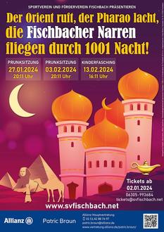 Unter dem Motto "Der Orient ruft, der Pharao lacht, die Fischbacher Narren fliegen durch 1001 Nacht!", haben unserer Aktiven wieder ein tolles und abwechslungsreiches Programm auf die Bühne gezaubert. Lassen Sie sich entführen in eine thematisch dekorierte Halle, die Lust auf das Entdecken entfernter Kulturen und Länder macht. Wir bieten aber noch viel mehr!