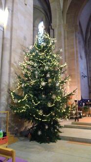 Die Bilder zeigen die Dutzend Helfer in der Abteikirche vor dem ungeschmückten Weihnachtsbaum und den geschmückten Baum.